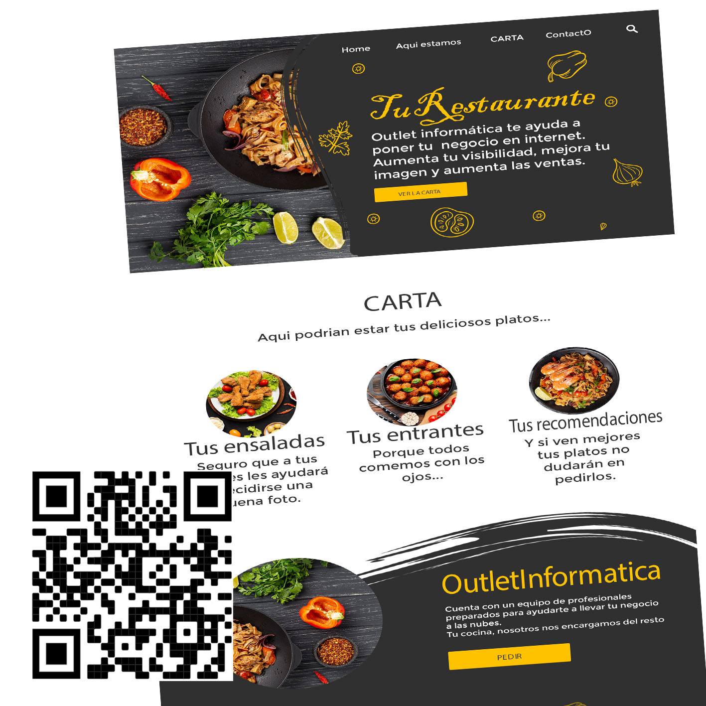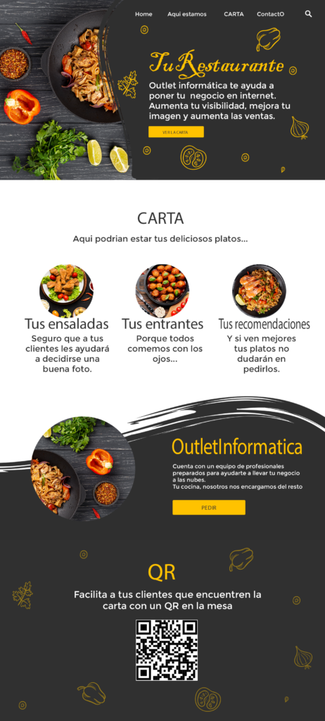 Con nuestro servicio de PÁGINA WEB BÁSICA + ALOJAMIENTO + DOMINIO + CARTA QR tendrás todo lo necesario para empezar con tu negocio o mejorar su visibilidad para que siempre que alguien quiera tener una buena comida, pueda encontrarlo.